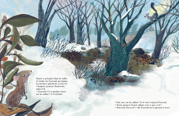 Un matin sombre et froid d’hiver, Souris se réveille et aperçoit une vive lumière sur le sommet d’une colline. Vite, il lui faut emmener tous ses amis afin d’observer ces rayons de plus près. Ecureuil, Biche, Tortue sont appelés, sans oublier la famille des canards et celle des ours qui se réveillent d’un long hiver. Tous ces animaux suivent Souris pour l’ascension de la colline, tout en se mettant au rythme de chacun.