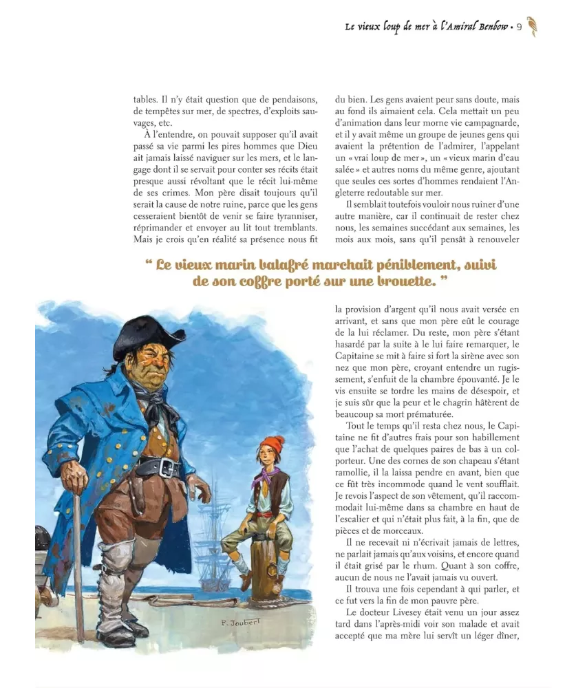 Cette édition soignée, en grand format, bénéficie de nombreuses illustrations de Pierre Joubert parfois en pleine page, parfois insérées dans le texte, qui lui donnent une saveur particulière. Joubert au sommet de son art parvient à rendre toutes les nuances et même les ambigüités de l’ouvrage, le mystère, l’atmosphère inquiétante, la sauvagerie des pirates contrebalancée par une galerie de trognes à la limite de la caricature.